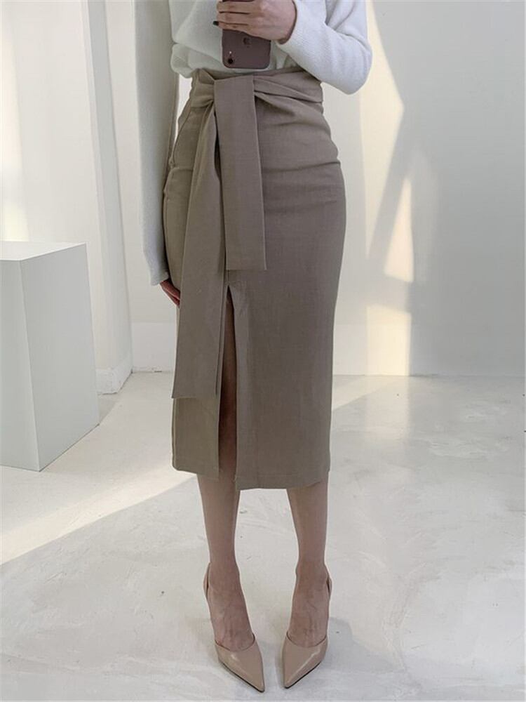 ハイウェスト タイトスカート スリット Aライン ミドル丈 レディース 大人気(カーキ ブラック ダークグレー)
