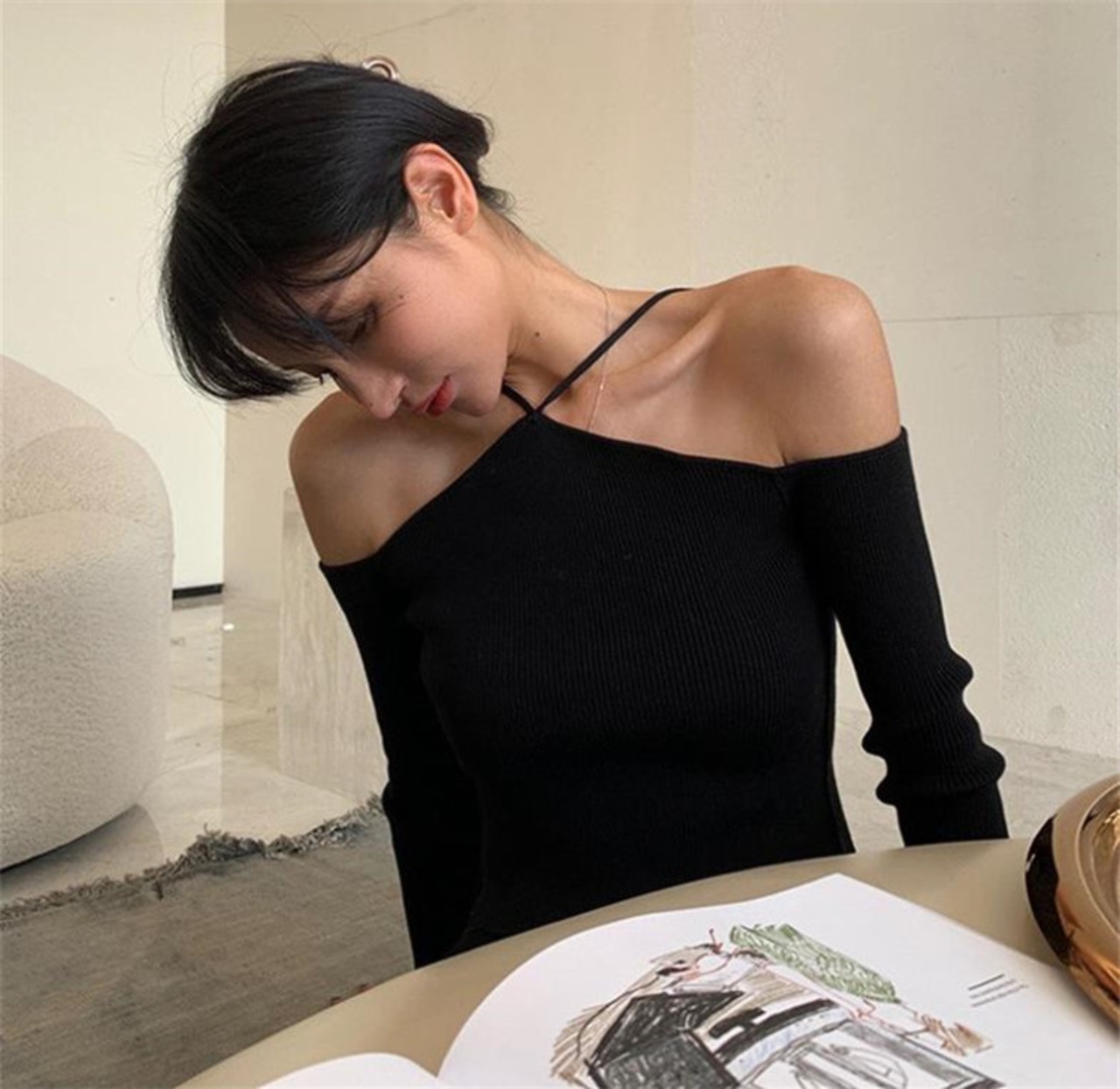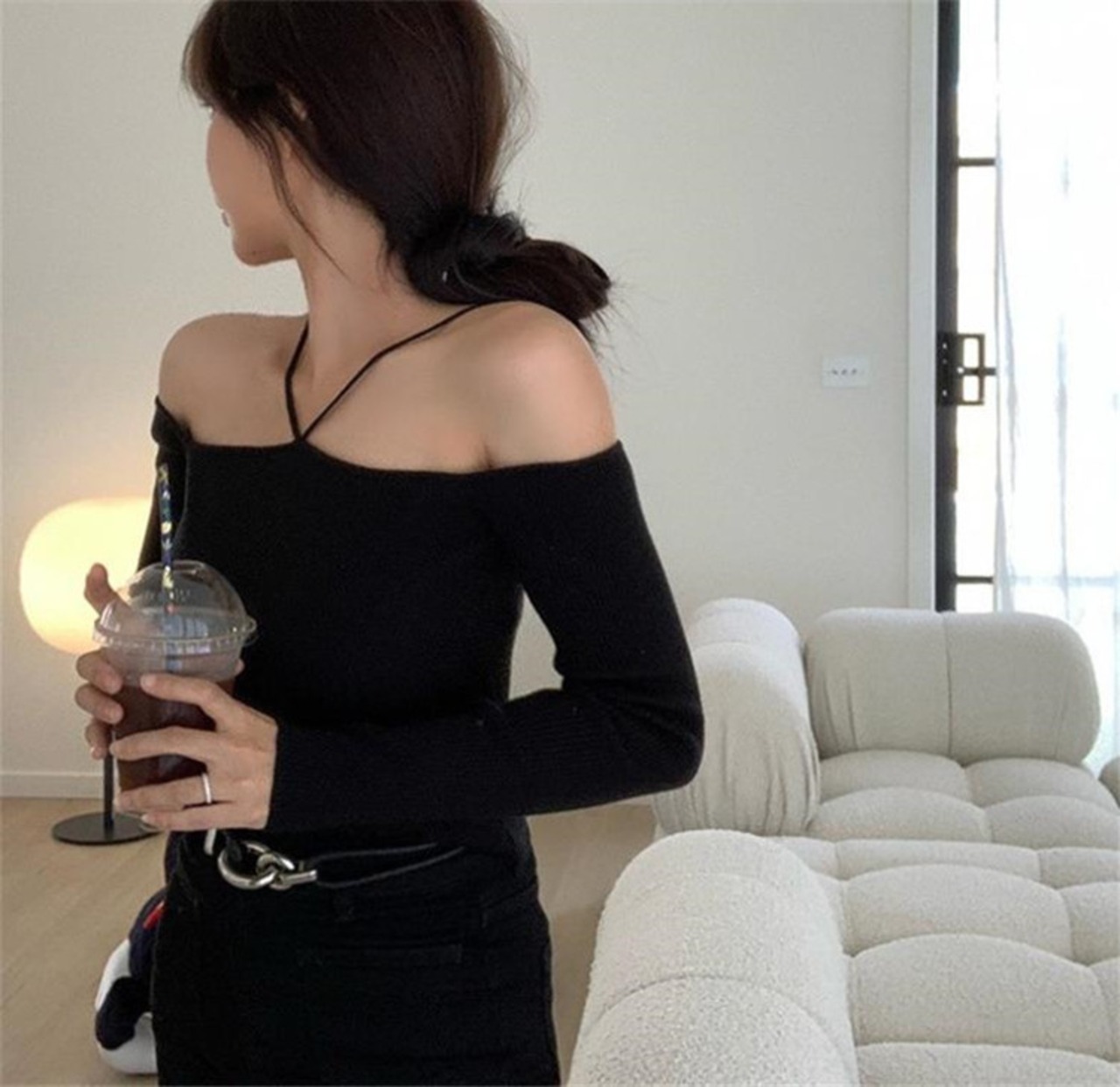 ショルダーストラップ セクシー ショート ニット トップス 細身(ホワイト ブラック)