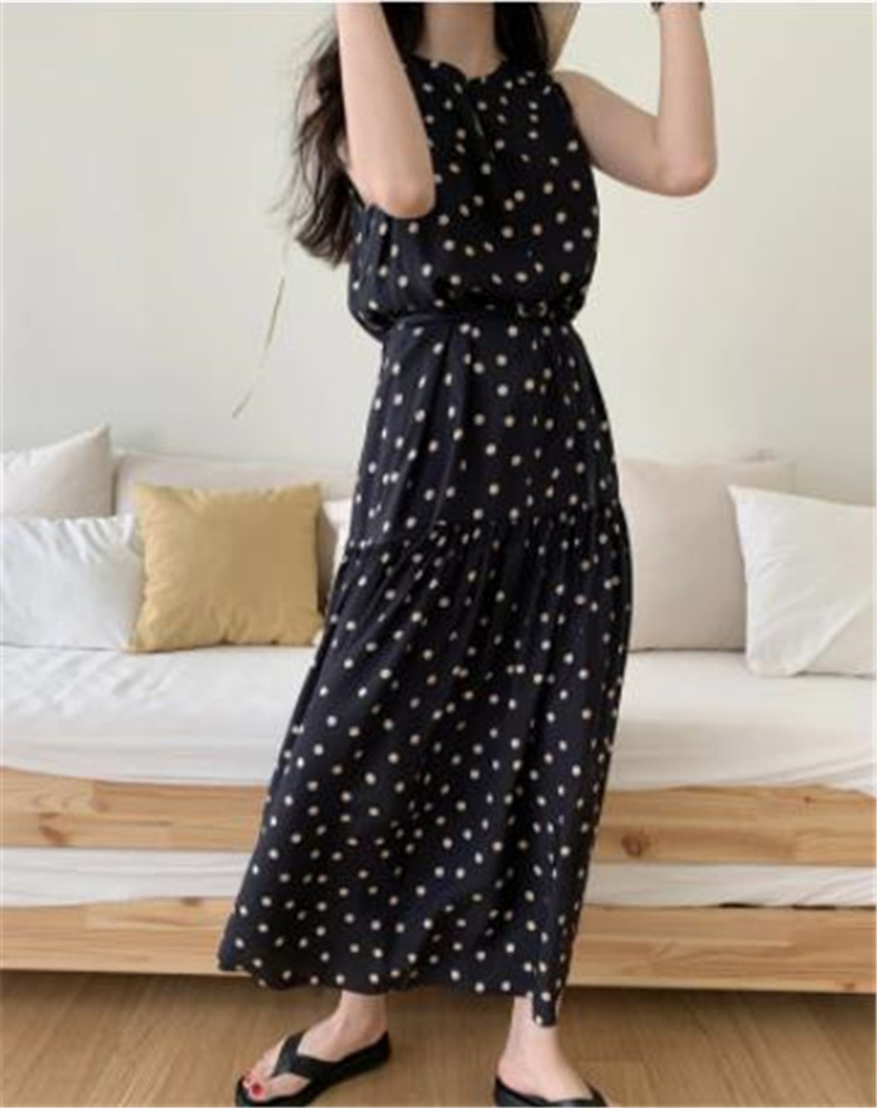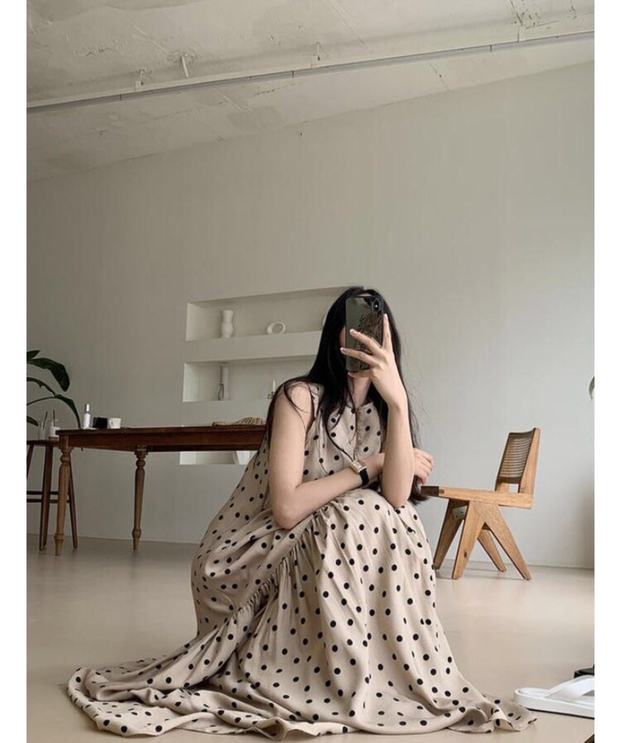 ゆったり ロングワンピース カジュアル 快適 袖なし ドット柄ティアード