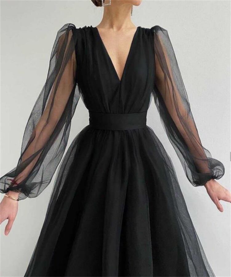 深いVネック ロングスカート ワンピース パフスリーブ(ブラック ピンク ワインレッド べージュ)