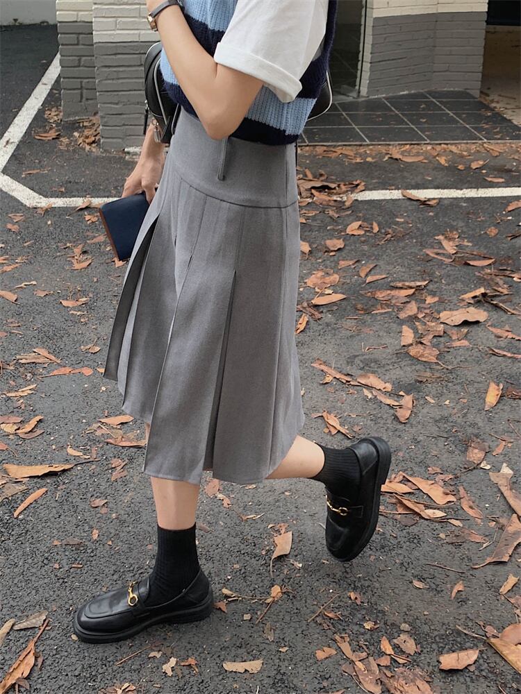 傘スカート プリーツ スーツスカート デザインセンス 着映えが狙える スリム(グレー ブラック)