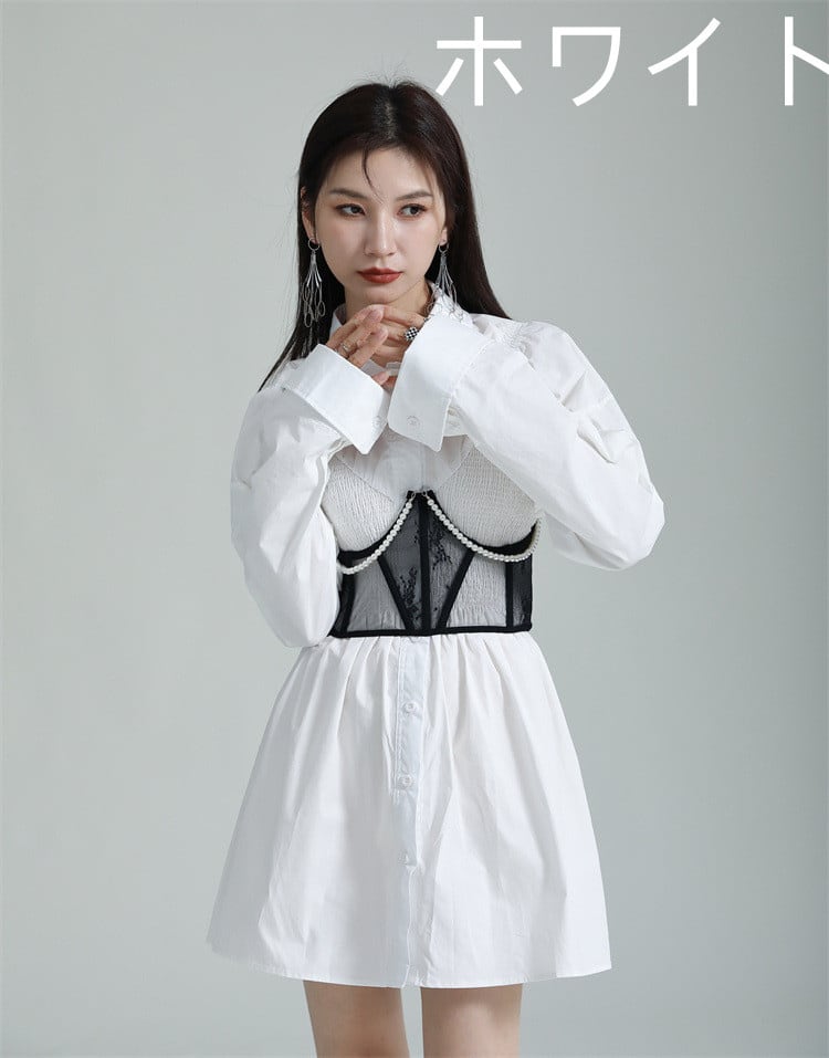 長袖 スリム Aライン シャツワンピース 自然体(ブラック ホワイト)