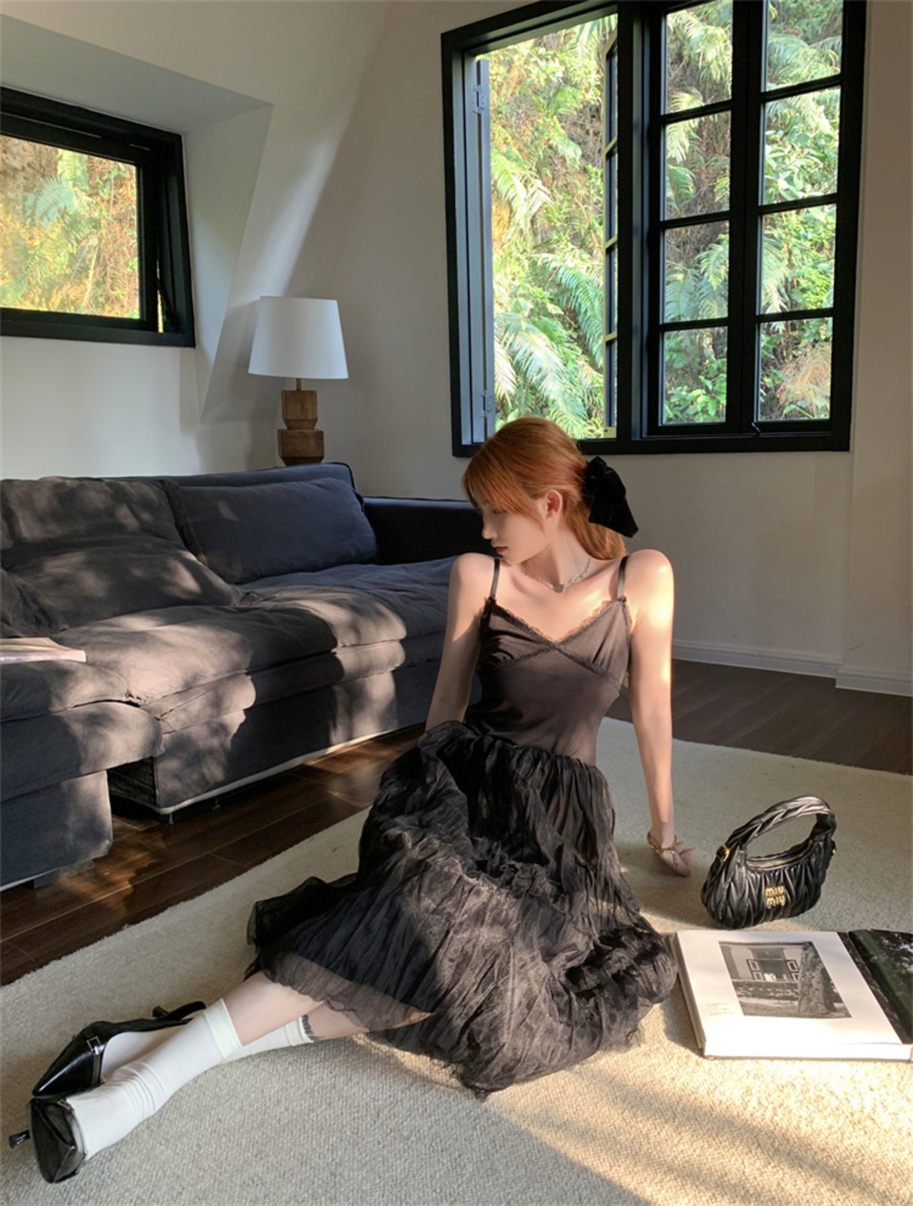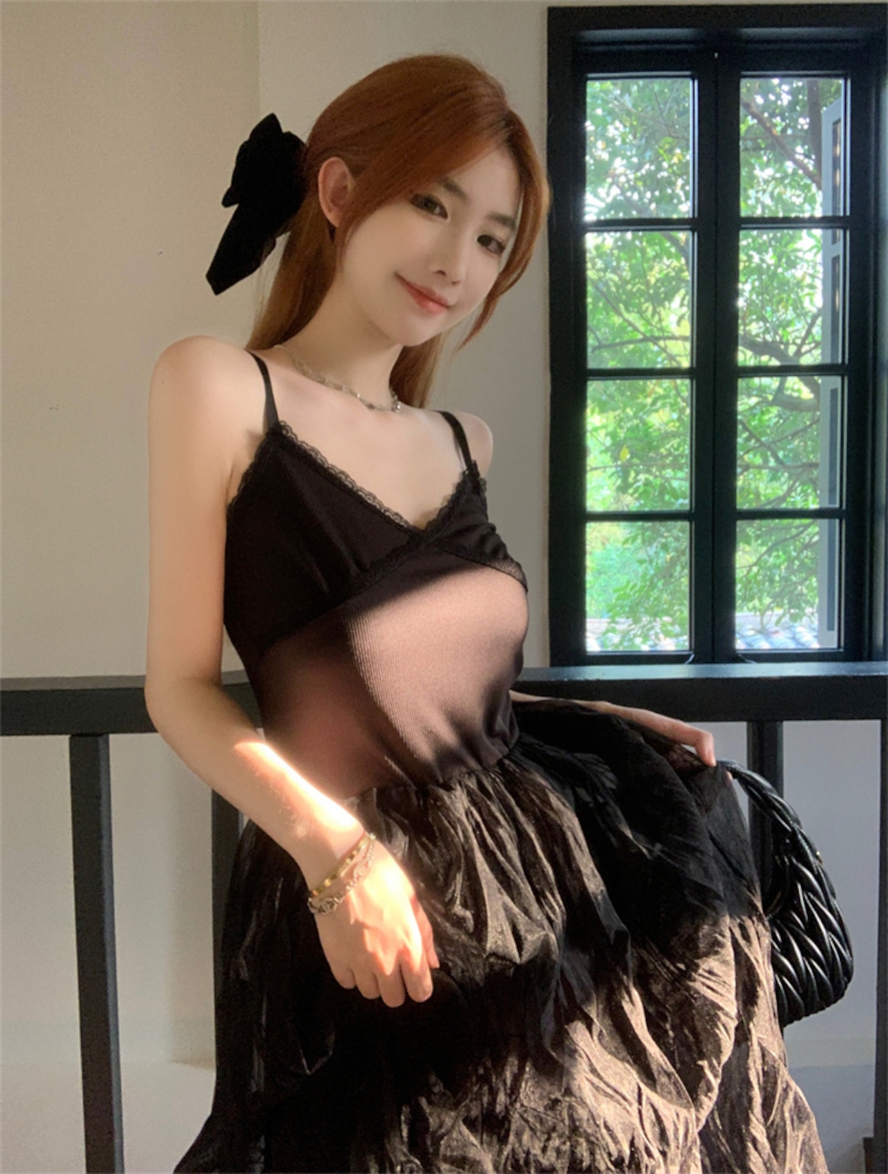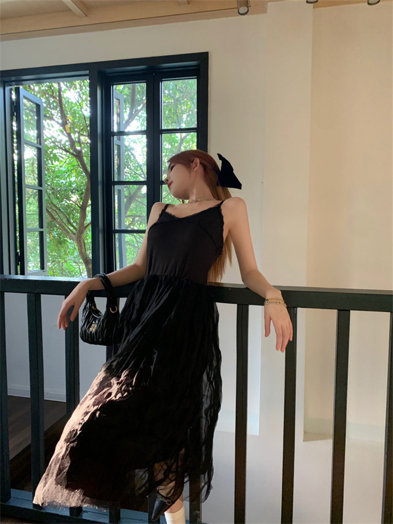 レース ロングスカート お出かけ ワンピース Vネック 細みせ美人シルエット(ブラック ホワイト)