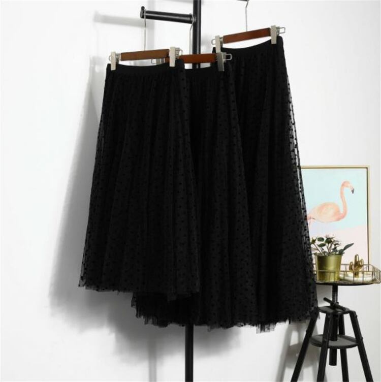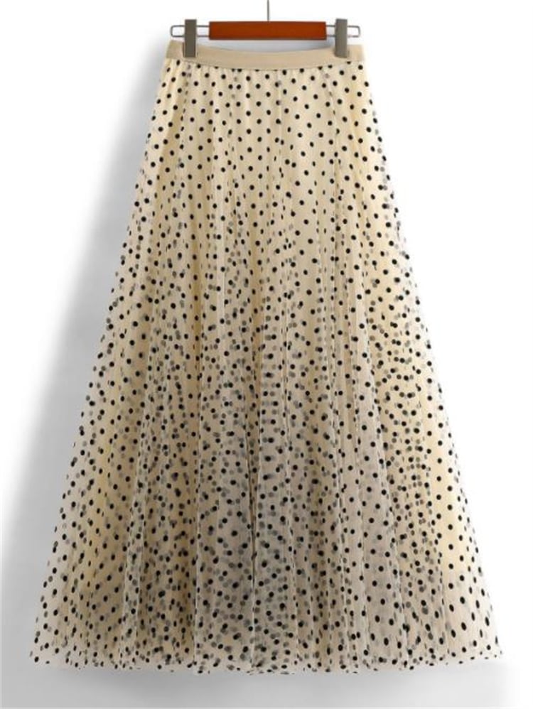 ロングスカート ギャザリング チュールスカート ドット(ブラック べージュ)