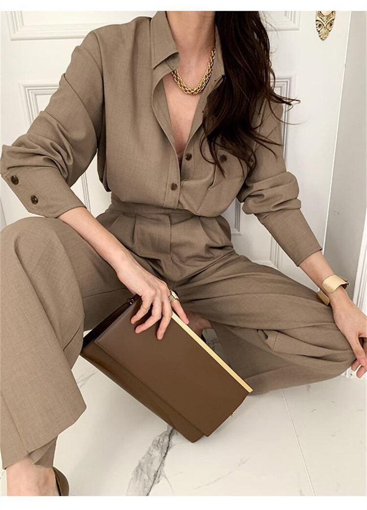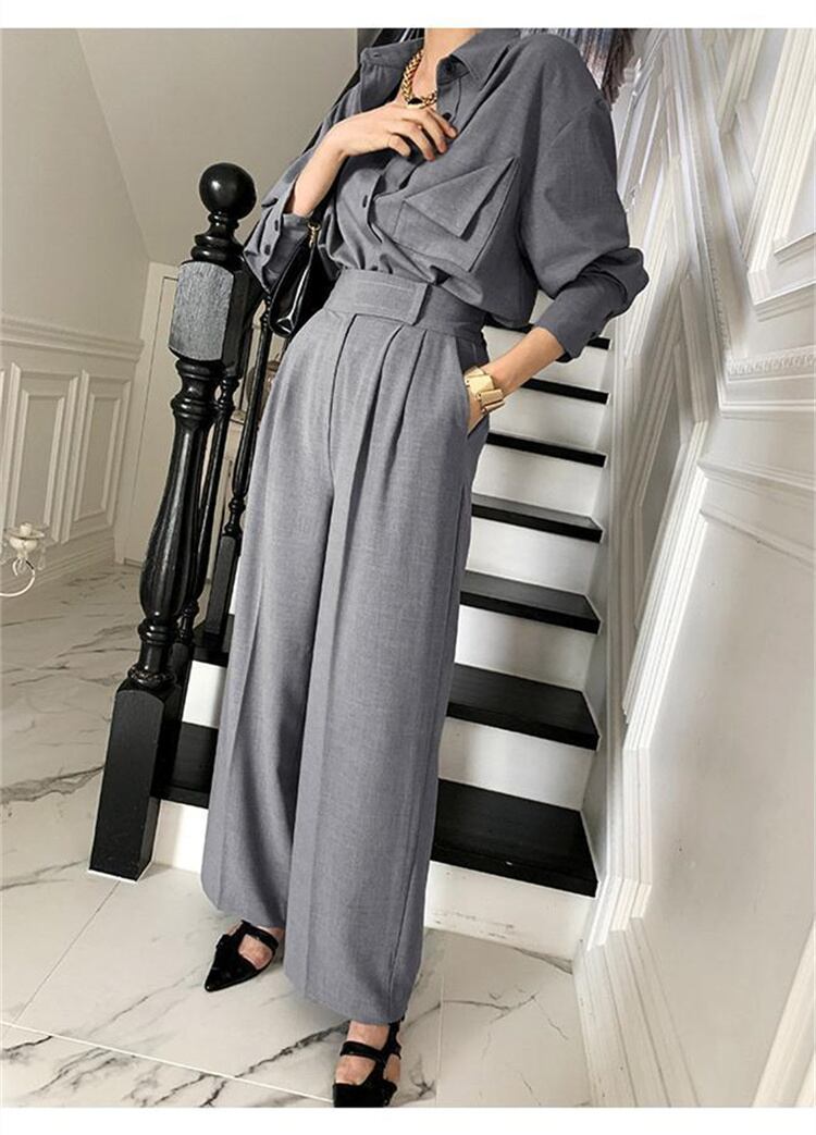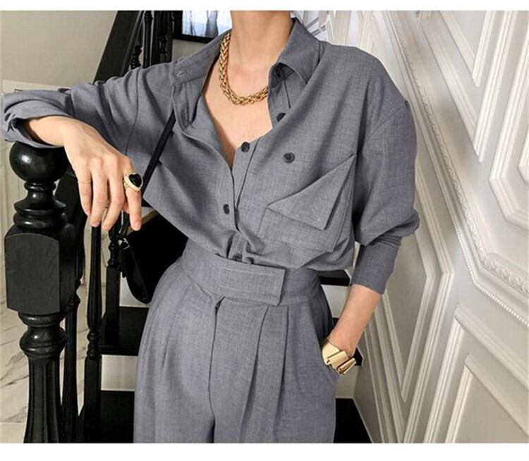 2点セット 長袖シャツ スラックス ロングパンツ ハイウエスト トレンド(グレー カーキ)