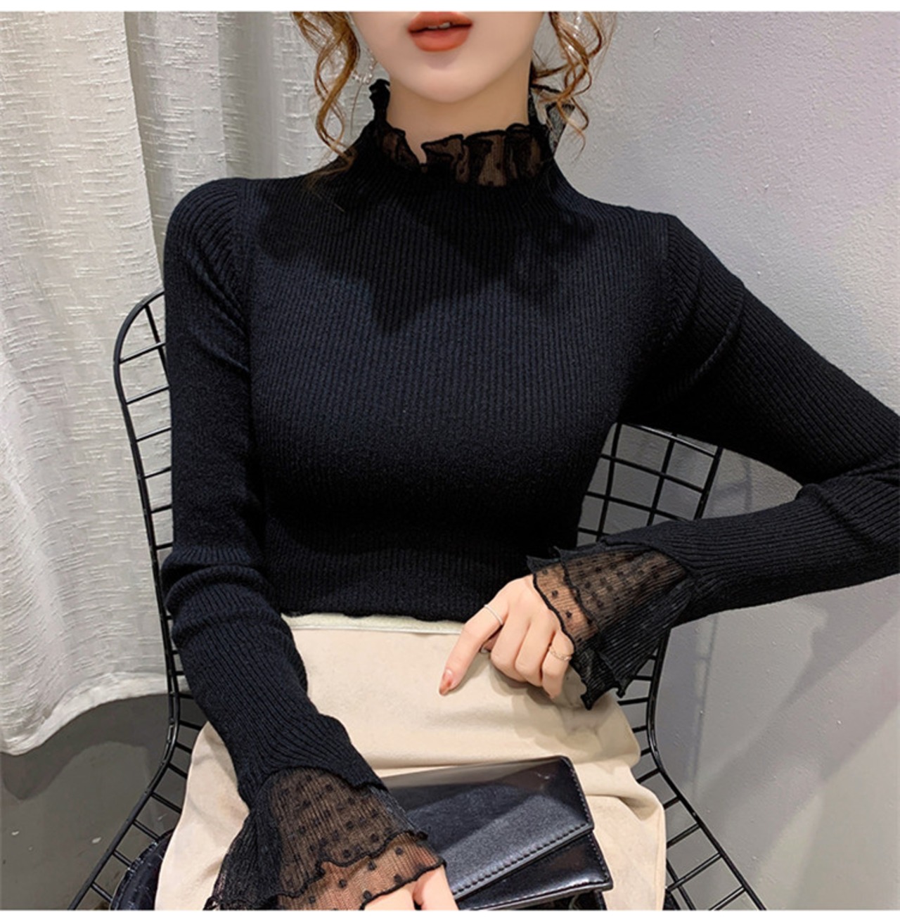 スリムフィット レース タートルネック 長袖 ニットトップス