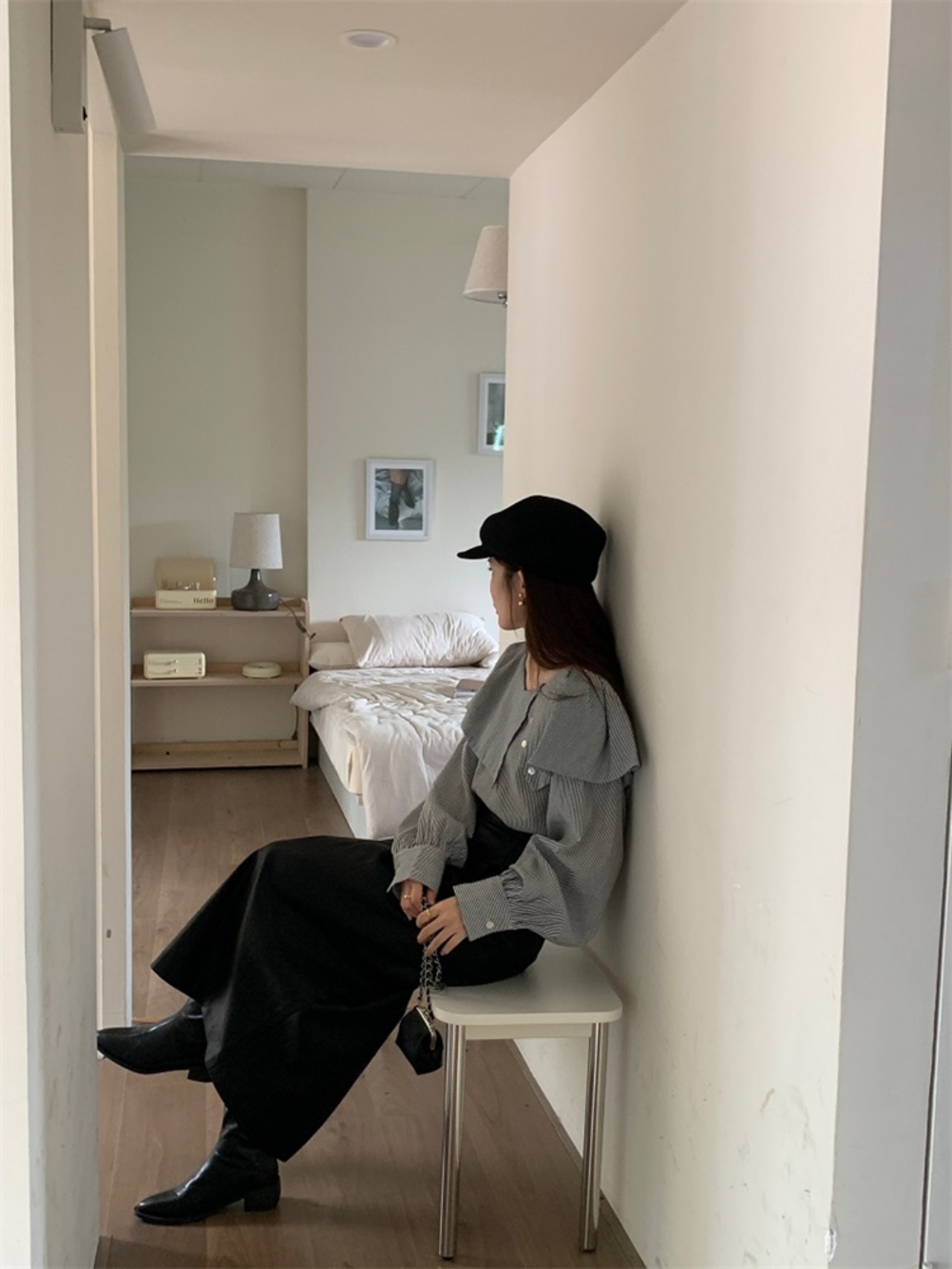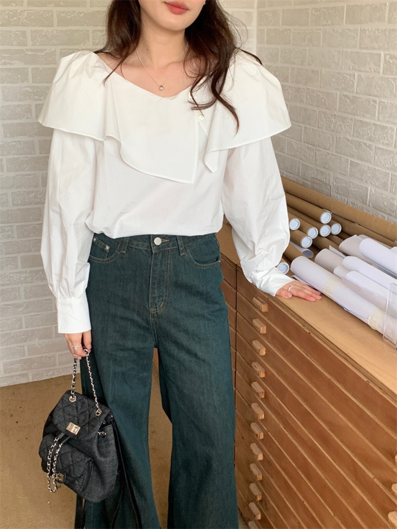大人のカジュアルアイテム ファッション フリル ストライプシャツ 肩出し長袖シャツ ゆったりする