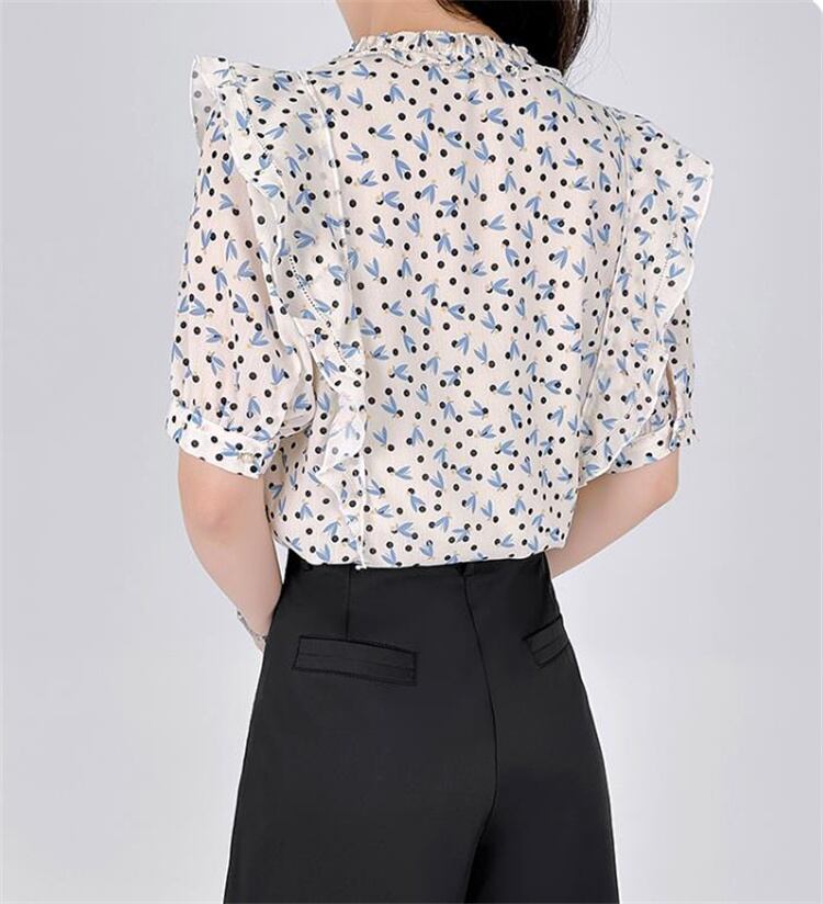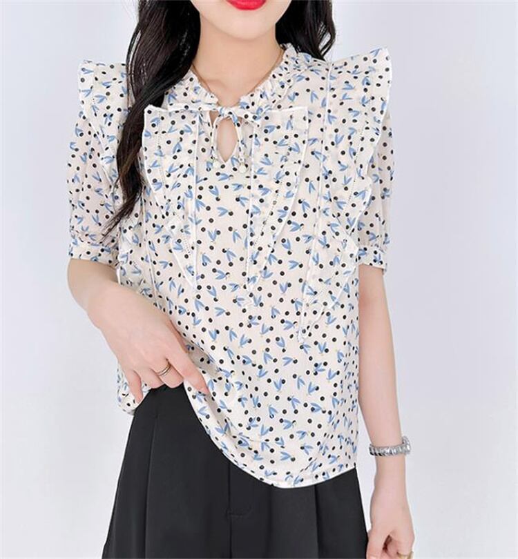早い者勝ち ドット 花柄 パフスリーブ Vネック 半袖上着 スリム シフォンシャツ