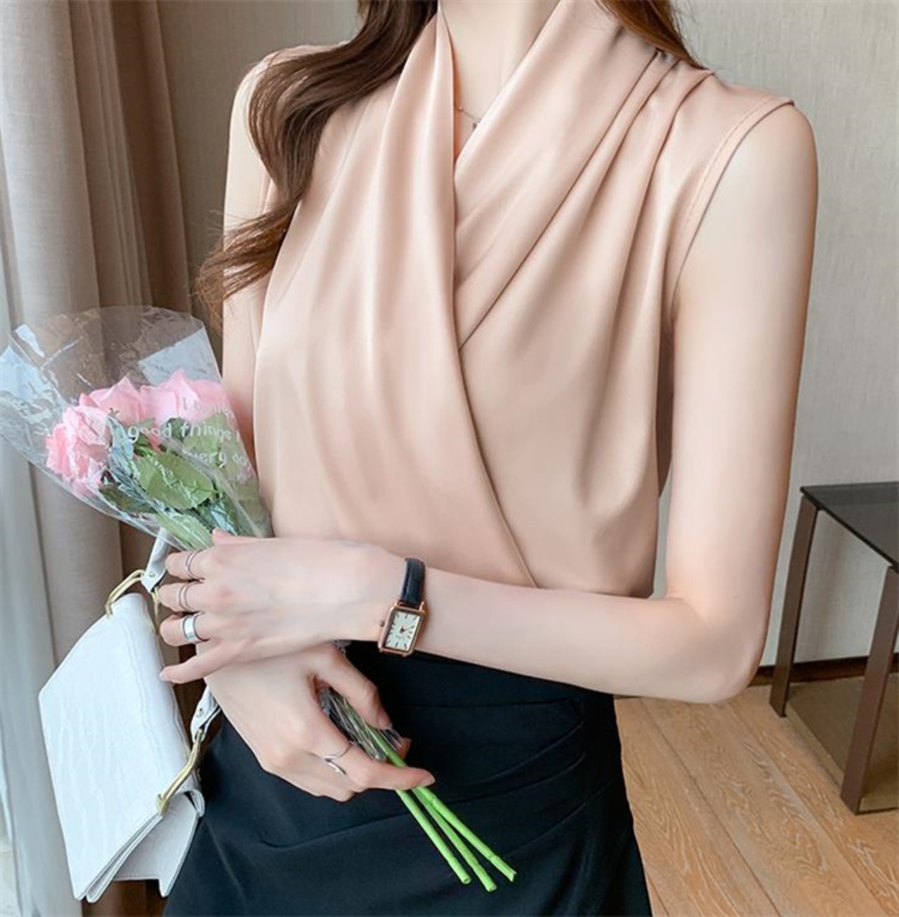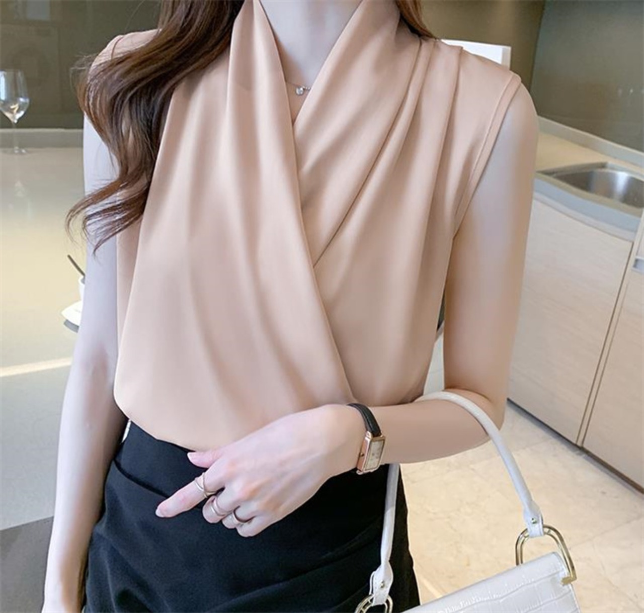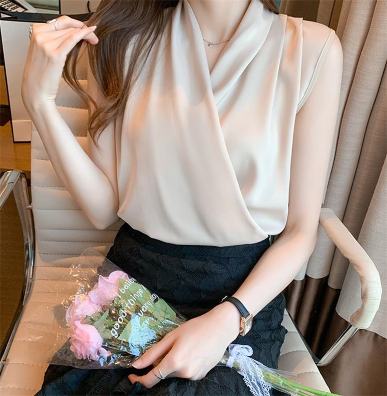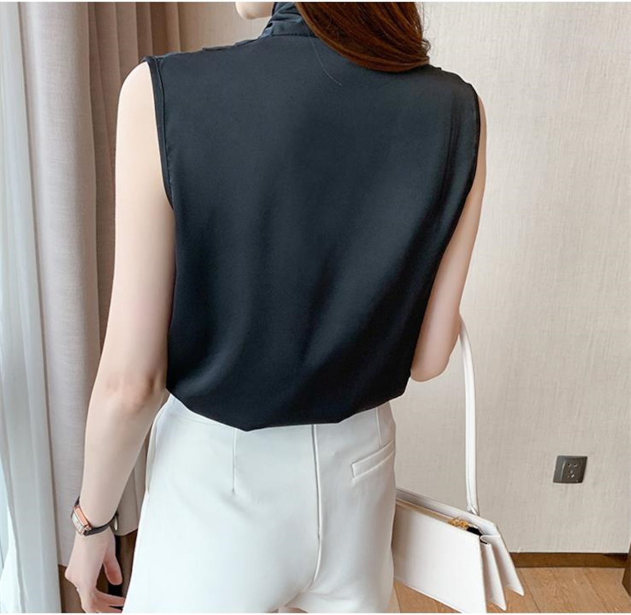人気のあるデザイン シフォンブラウス 袖なし ピュアカラー デザインセンス トップス