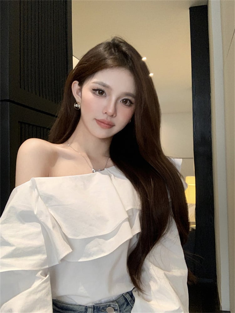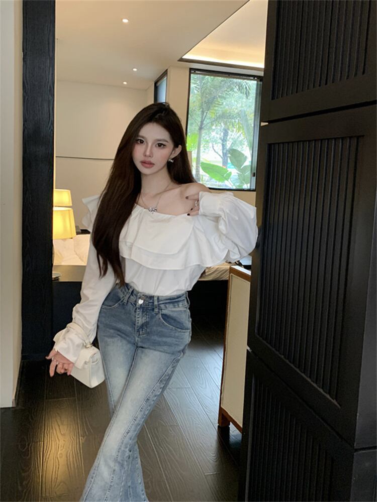 フリル オフショルダー 長袖 シャツ 上着 スリム 快適 レディース