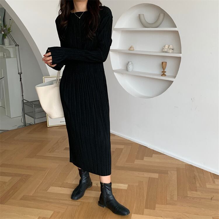 伸縮性のあるウエスト ワンピース ラウンドネック フォールド