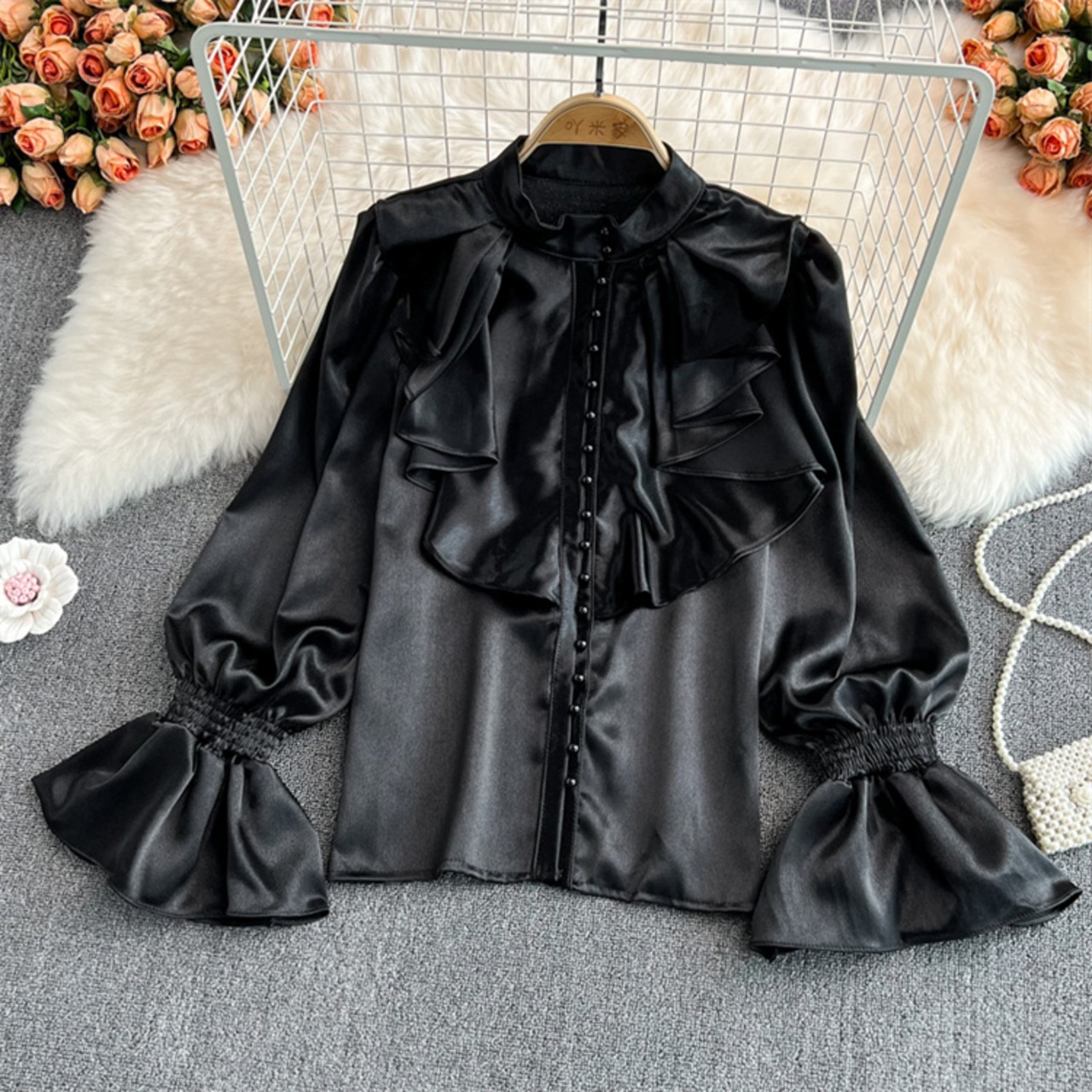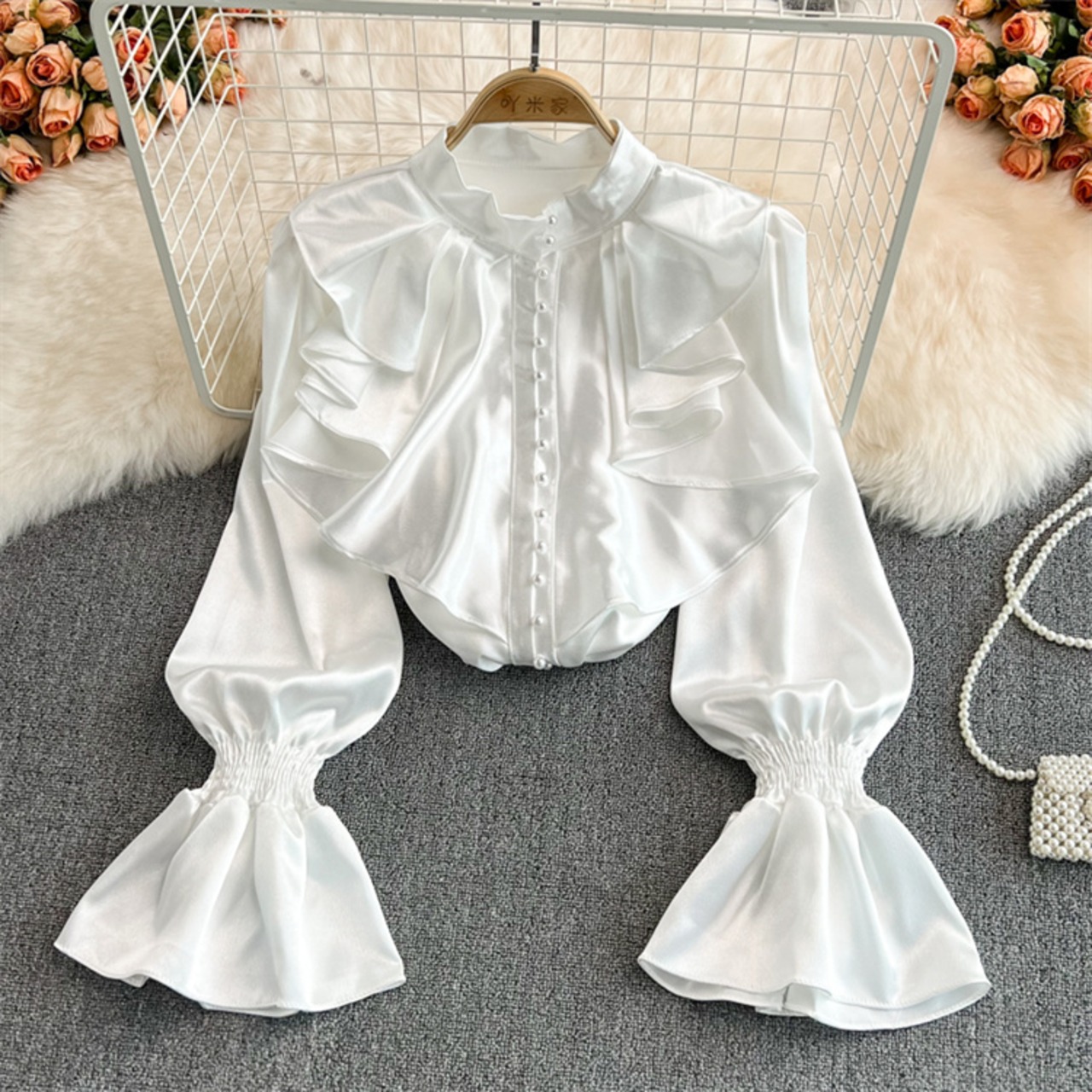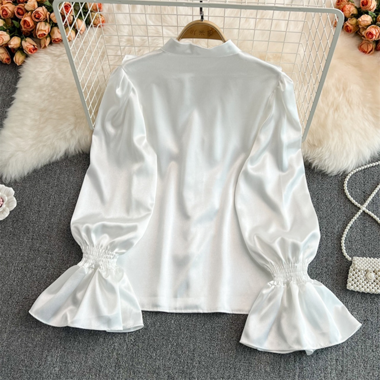 ゆったり ホーンスリーブ ギャザリング 詰め襟 上着 シャツ ブラウス 洋服 レディースファッション