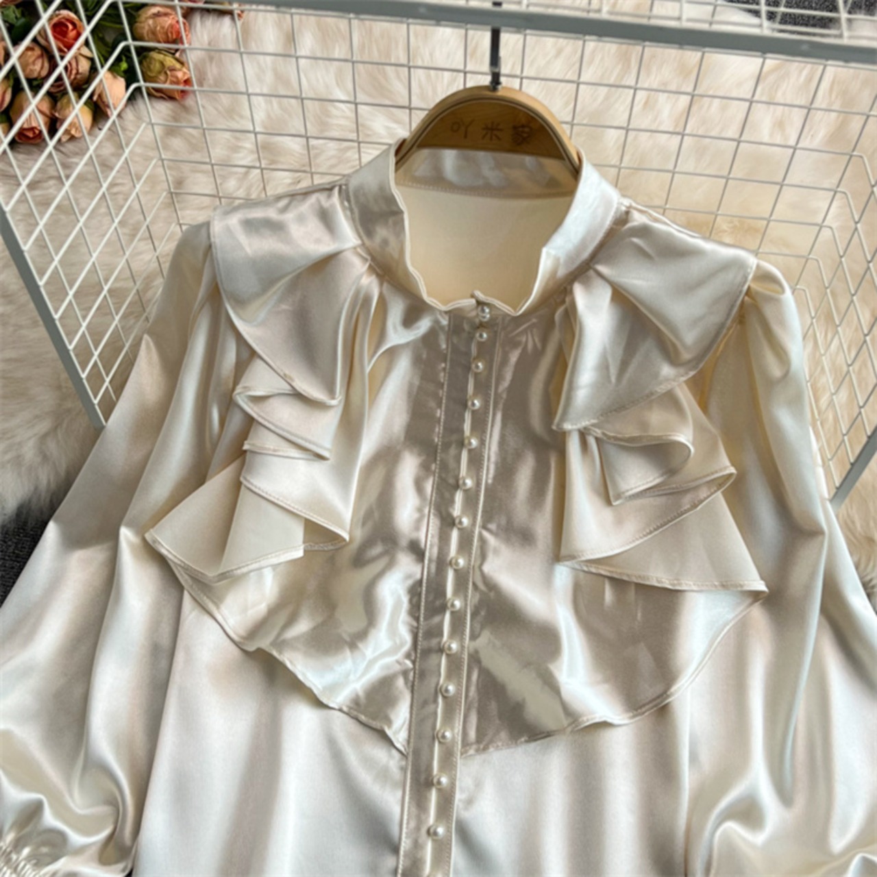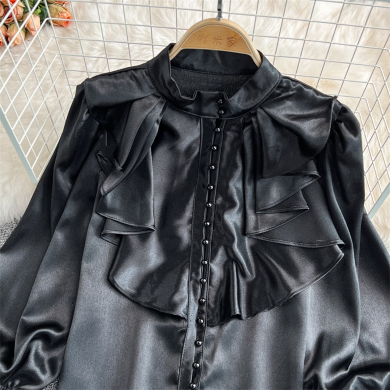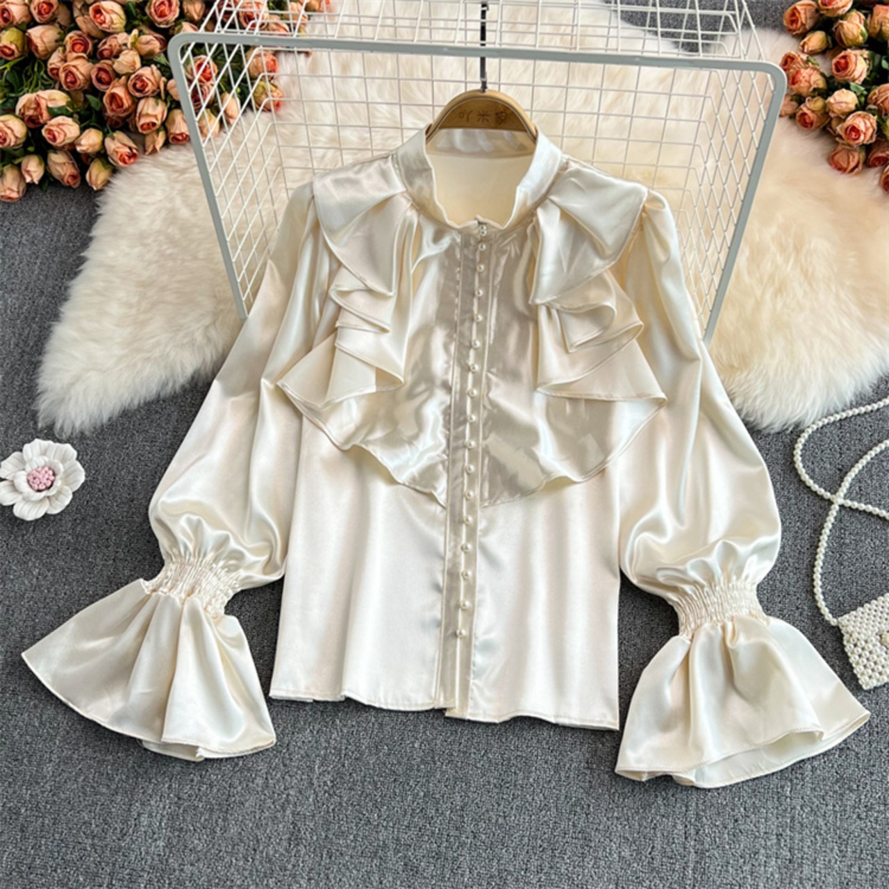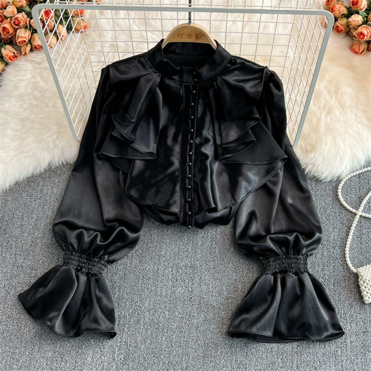ゆったり ホーンスリーブ ギャザリング 詰め襟 上着 シャツ ブラウス 洋服 レディースファッション