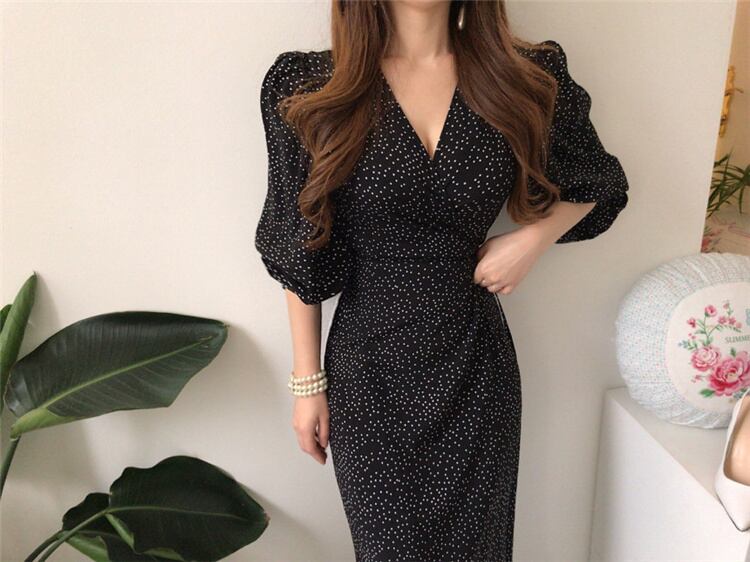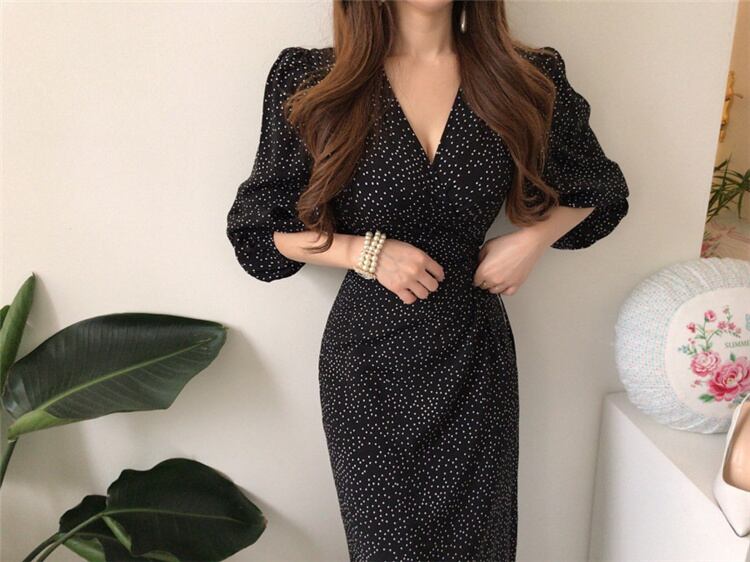 ワンピース スリムフィット 小さなドット バンディング パフスリーブ Vネック ロング