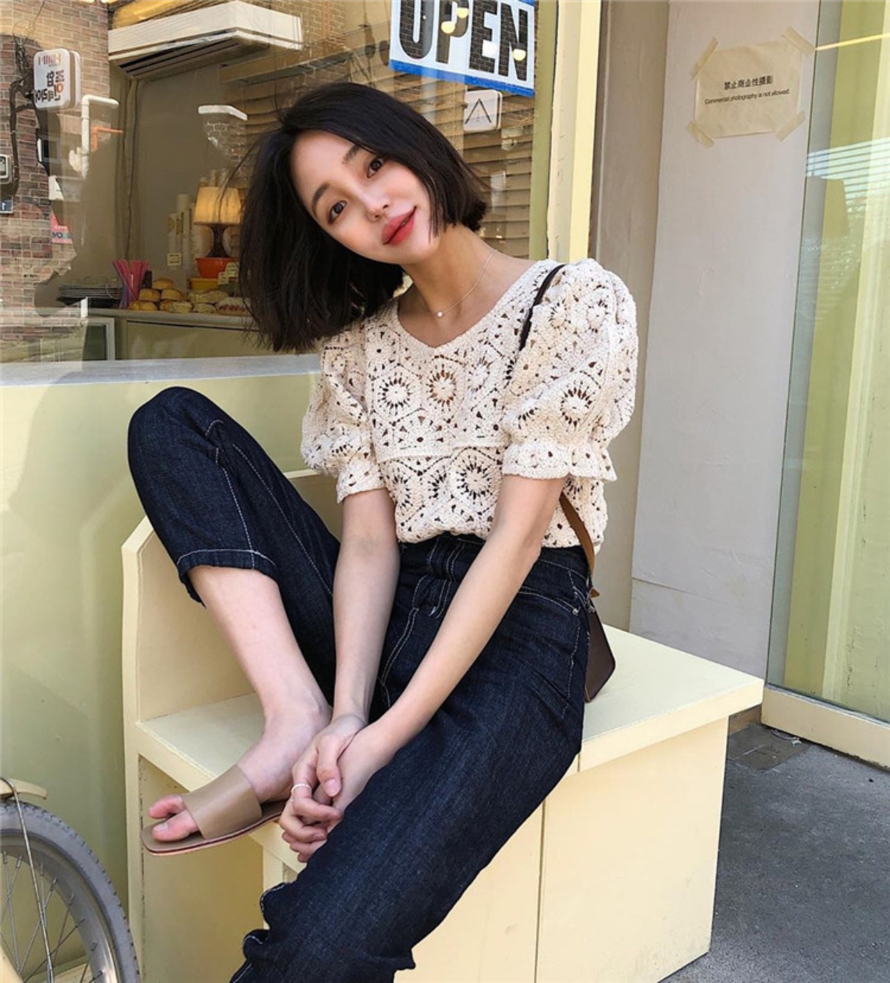 おしゃれの必需品 上品映え ノックアウト フックフラワー パフスリーブ 透け感 トップス Vネック スリム