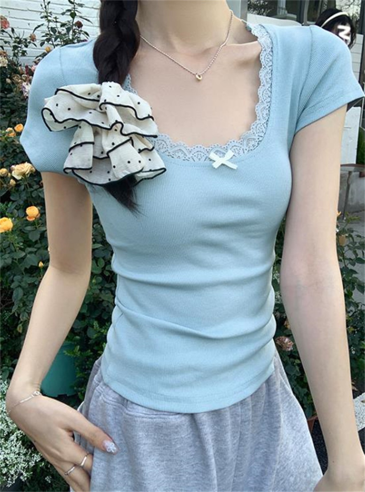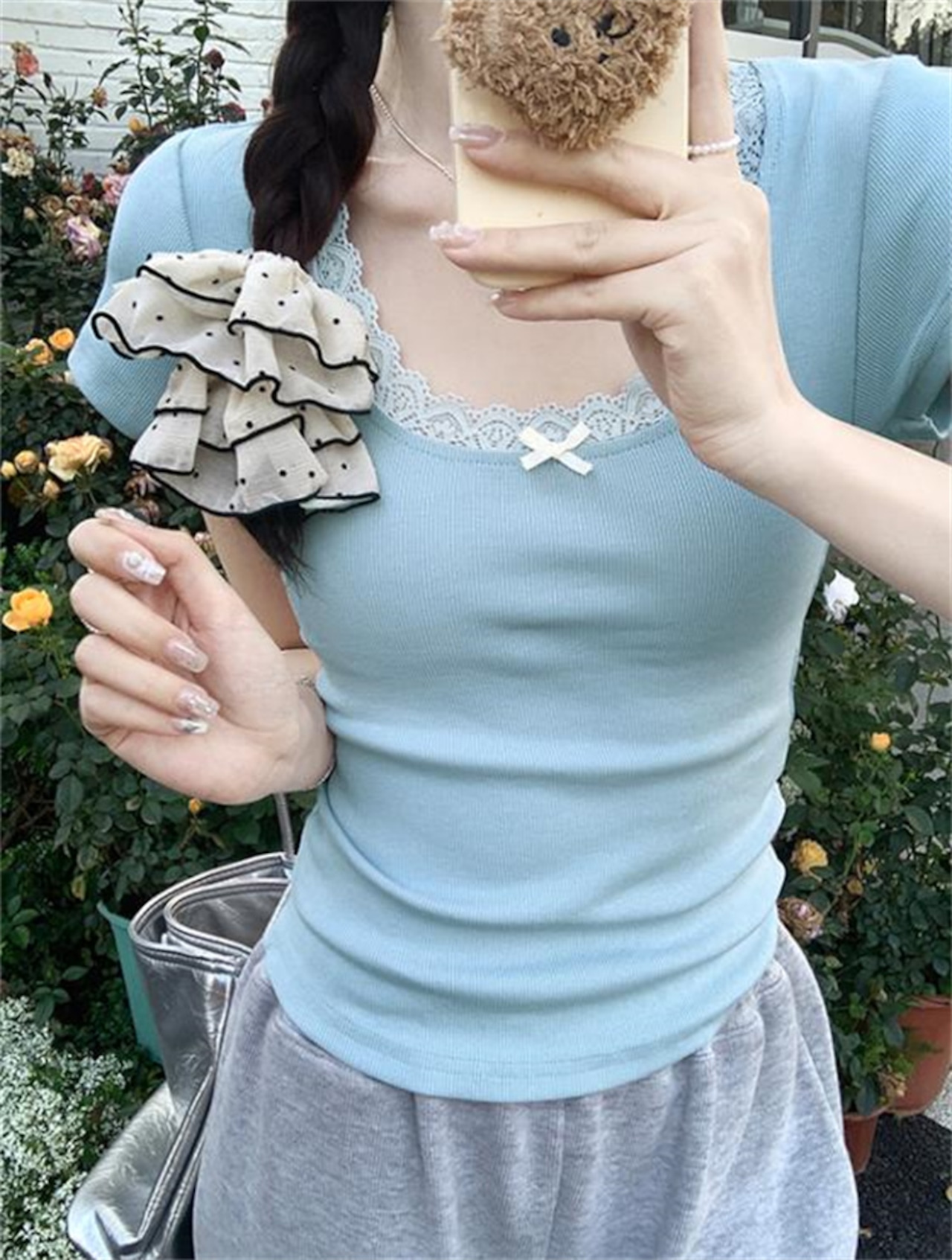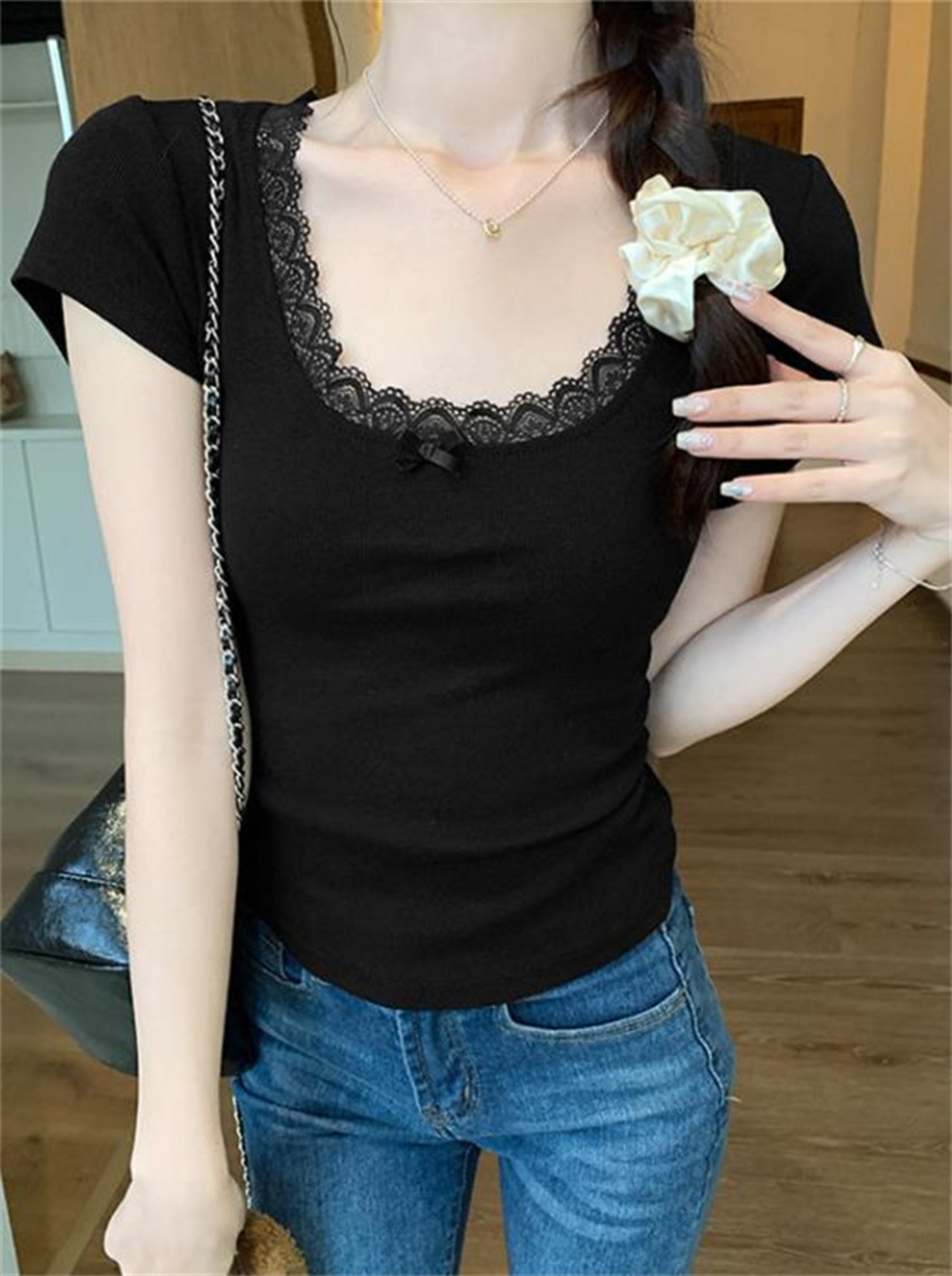 レース 半袖 Tシャツ 蝶ネクタイ レディース トップス 上着 パッチワーク 洋服 レディースファッション