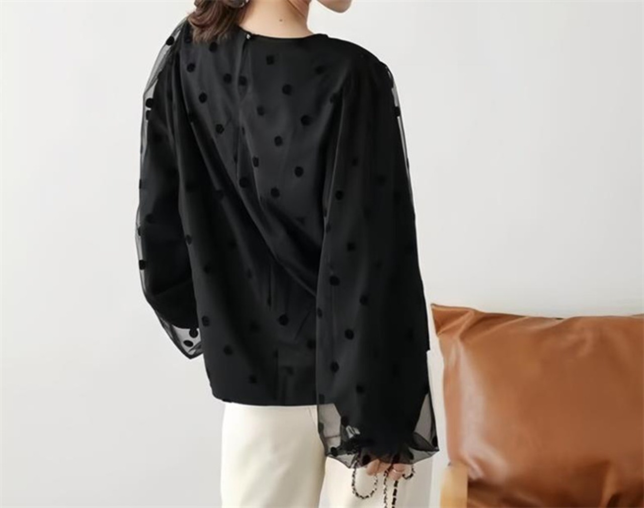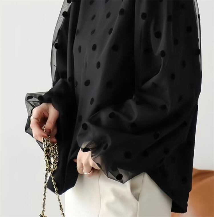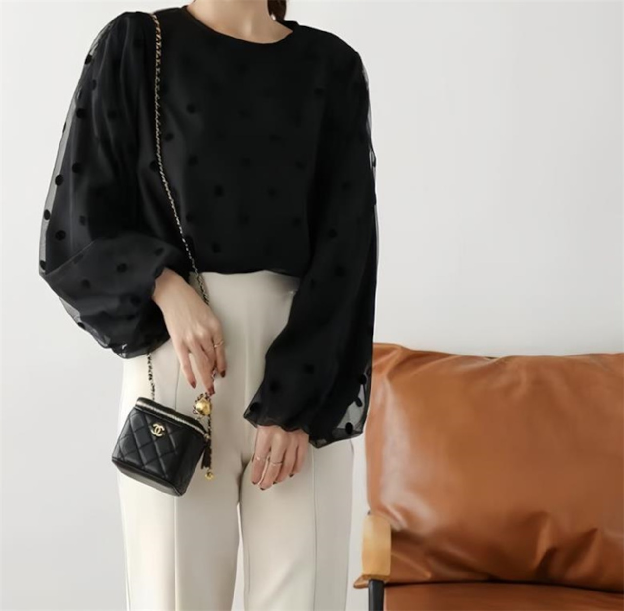 細見えする トップス ラウンドネック パフスリーブ レーヨン ドット